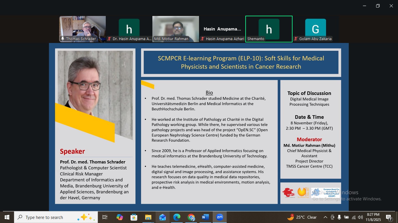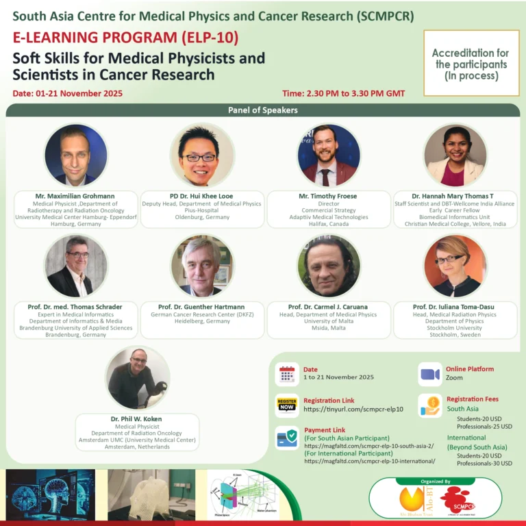 The South Asia Centre for Medical Physics and Cancer Research (SCMPCR) successfully conducted its E-Learning Program (ELP-10): “Soft Skills for Medical Physicists and Scientists in Cancer Research” from 1 November to 21 November 2025. The program was organized as part of SCMPCR’s ongoing commitment to quality education and capacity building in medical physics and cancer research, with the aim of enhancing both technical knowledge and professional competencies among medical physicists and early-career scientists.
